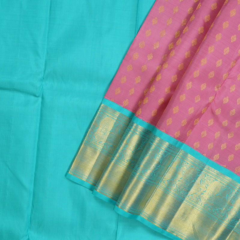 A soft and charming contrast defines this beautiful Rose Pink Kanjivaram Pattu Pavadai, framed by a delicate Sky Blue Border, suitable for ages 10-15 years. The body is woven with elegant floral buttas, and the border is adorned with the majestic peacock motifs. This is an ideal pure silk dress for sophisticated daytime events.