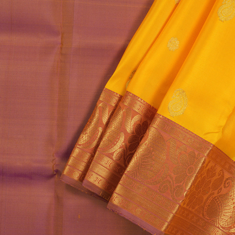 Brighten up any occasion with this delightful handloom Pattu Pavadai, perfect for 6 months to 1 year babies. The attire features a cheerful, warm Mango Yellow skirt, which is beautifully contrasted by the festive Dual toned pink blouse & border, adding depth and vibrancy.