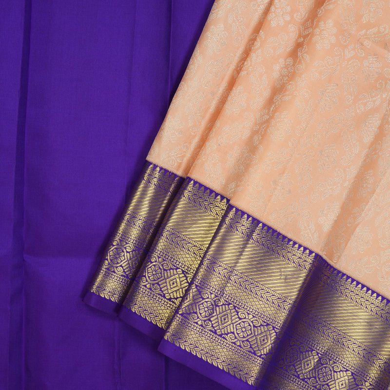 This elegant Handloom Pattu Pavadai for babies aged 6 months to 1 year features a soft peach skirt enriched with shimmering brocade jari work. The delicate design is beautifully framed by a striking violet border and a matching violet top, offering a regal contrast for any special occasion.