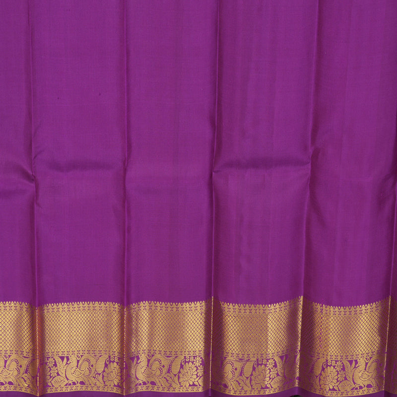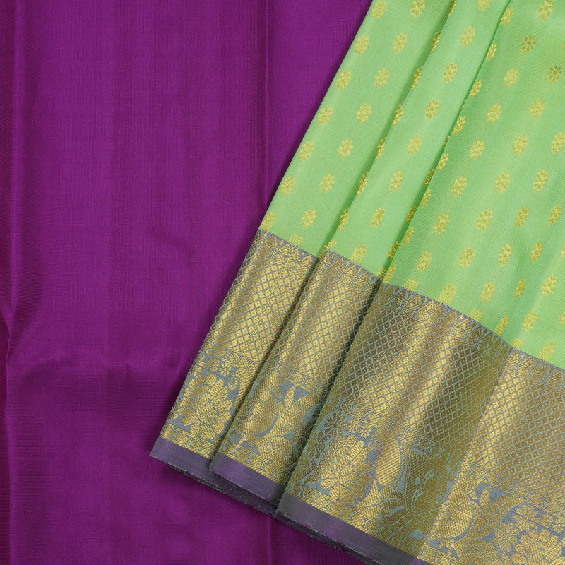 This delightful Pista Green Handloom Pattu Pavadai is a breath of fresh air for your baby's ethnic wardrobe. The skirt is adorned with dainty butta motifs, offering a subtle shimmer that is beautifully elevated by a rich purple border and matching top.