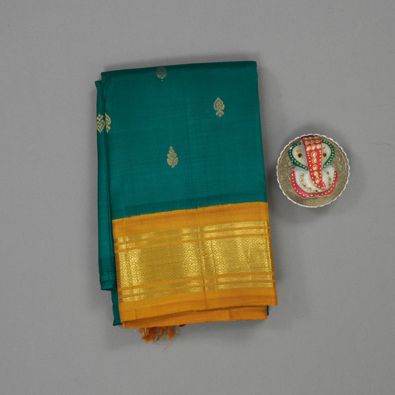 Timeless elegance meets traditional craft in this emerald green Kanjivaram silk saree. It features a striking one-side korvai border in rich mustard, perfectly coordinated with a matching mustard pallu for a bold, classic contrast.