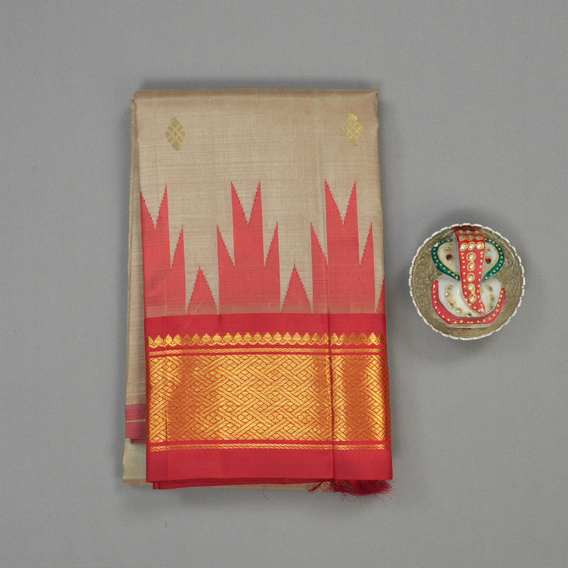 A soft, classic contrast defines this elegant Beige Lightweight Kanjivaram, framed by a vibrant Red Border. This lightweight silk features a simple rekku border design.