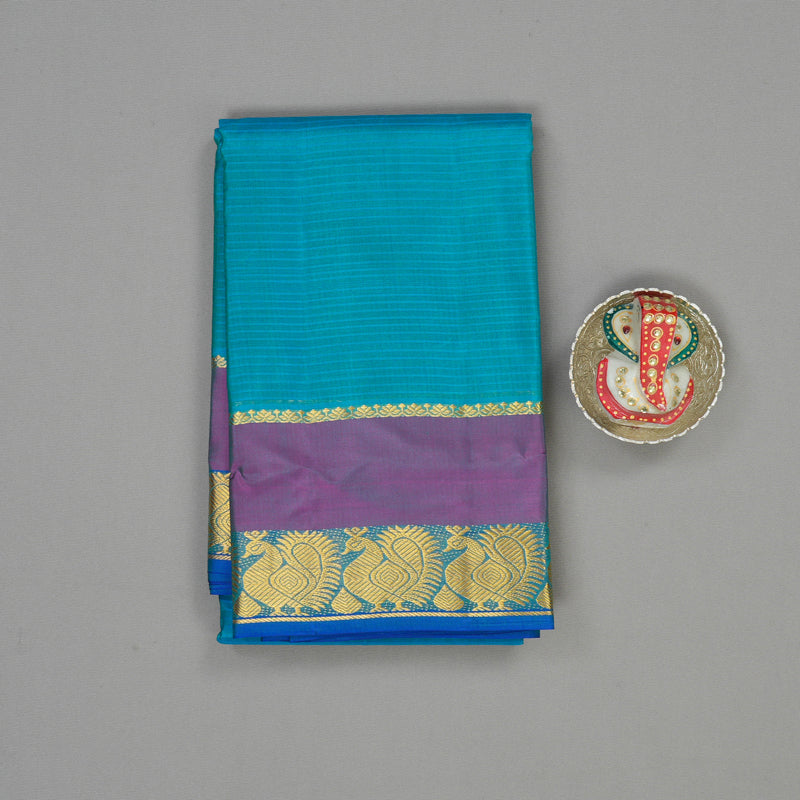 A vibrant, rich contrast defines this Blue-Green Lightweight Kanjivaram Silk Saree, framed by a deep Purple Border. This easy-to-drape silk features graceful peacock buttas on the border, providing an elegant and festive drape without the weight. This is an ideal pure silk saree for celebrations.