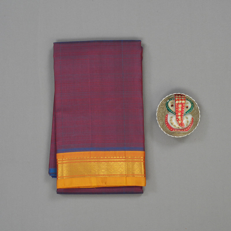 A distinctive Dual Tone (Wine & Blue) body gives this Lightweight Kanjivaram Silk Saree a rich, dynamic look. This pure silk piece achieves a brilliant contrast, highlighted by a bold Orange Border, ensuring it stands out in any collection.