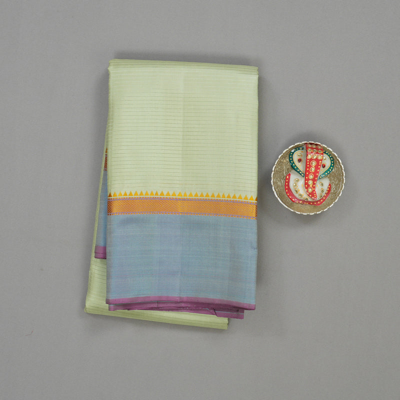 Own this beautiful Pastel Green Lightweight Kanjivaram for ₹10,710. This excellent value offers a comfortable drape with subtle stripes and traditional zari border work. Invest in this durable, high-value, and elegantly coloured piece.