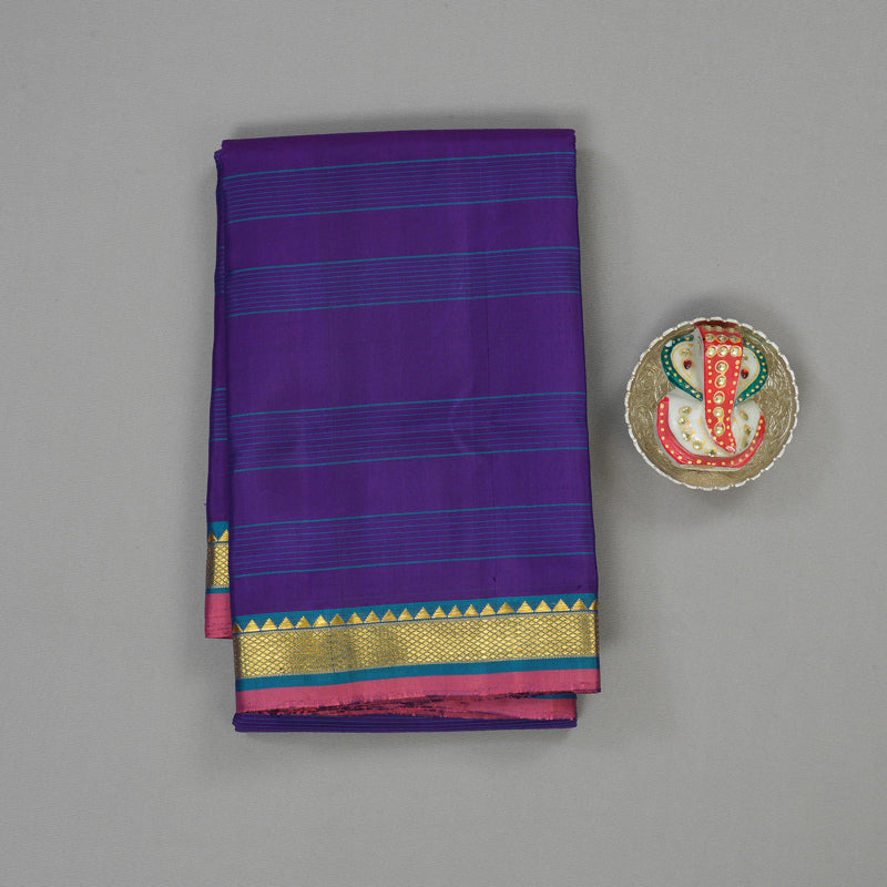 Experience a refreshing blend of hues in this purplish blue Kanjivaram silk saree, featuring elegant rama blue stripes flowing across the body. Designed for comfort and grace, it is framed by a small border, keeping the look light and sophisticated.
