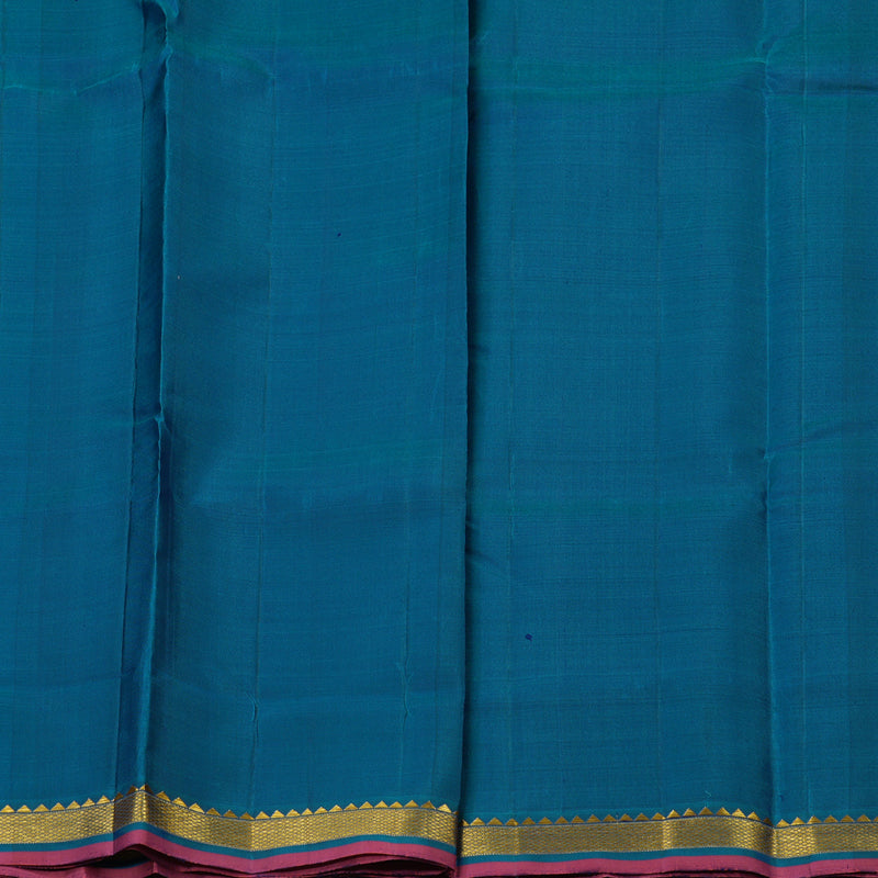 The ensemble is perfectly paired with a vibrant rama blue pallu and blouse, creating a cool-toned, harmonious aesthetic. Priced at ₹11,500, this casual wear Kanjivaram is an excellent choice for work functions, small parties, or festive daytime gatherings.