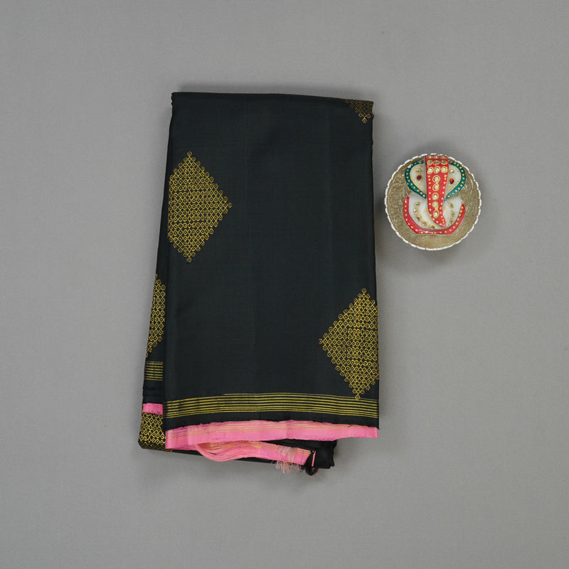 Make a statement of timeless elegance with this Borderless Black Vintage Kanjivaram Silk Saree. The entire body is delicately woven with traditional kolam motifs, turning the drape into a beautiful piece of South Indian floor art. The borderless design highlights the all-over patterning.
