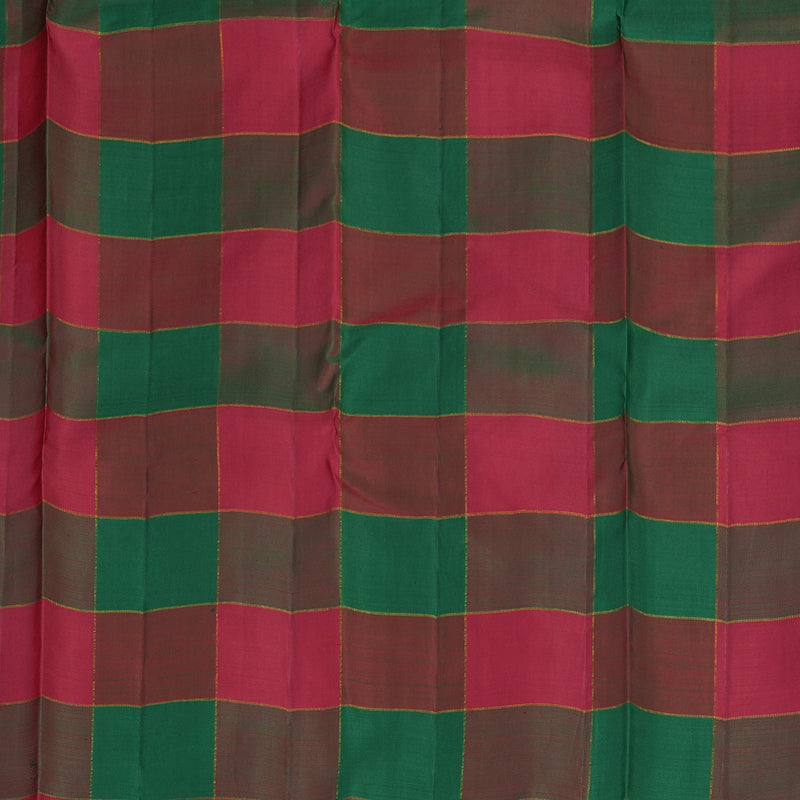 Discover the clean, borderless sophistication of this Blue Vintage Kanjivaram Silk Saree. The body is patterned with subtle stripes, while the thalappu (pallu) is the focal point, featuring beautiful buttas in a colourful check pattern, ensuring a dramatic, vibrant sweep.