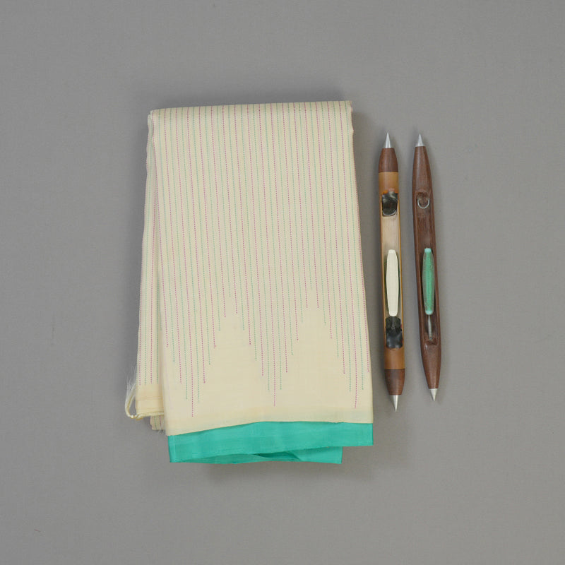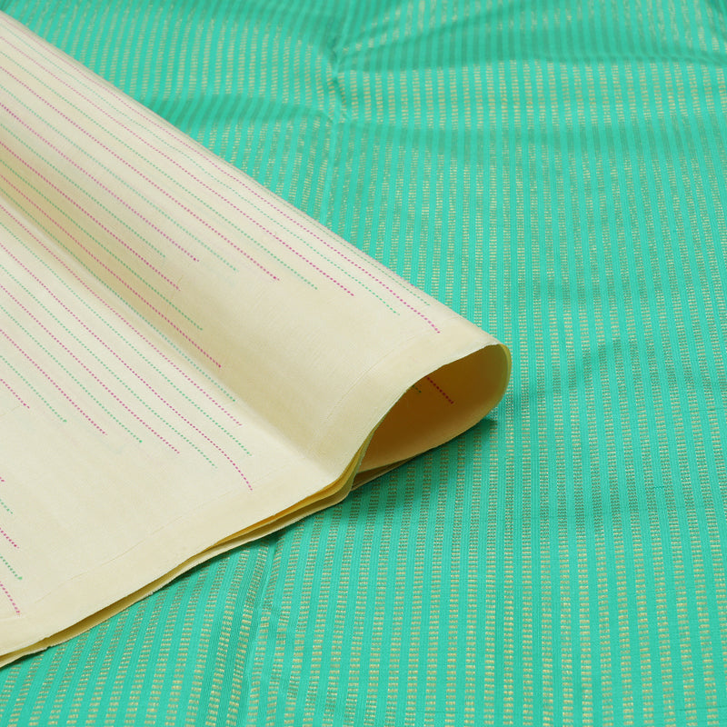 Embrace the serene purity of this classic Borderless Half White Kanjivaram Silk Saree. The elegant simplicity of the borderless design highlights the subtle texture of fine stripes woven across the body. This is a look of timeless, unadorned grace and sophisticated minimalism.