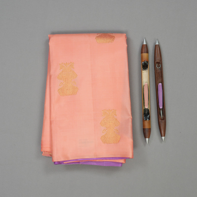 A magnificent Borderless Vintage Kanjivaram Silk Saree in a stunning light Pink shade. This exclusive pure silk is richly detailed with large chakram motifs on the thalappu (pallu) and iru thala pakshi motifs (twin-headed birds) on the body, symbolizing auspiciousness and grandeur. This is an heirloom quality silk.
