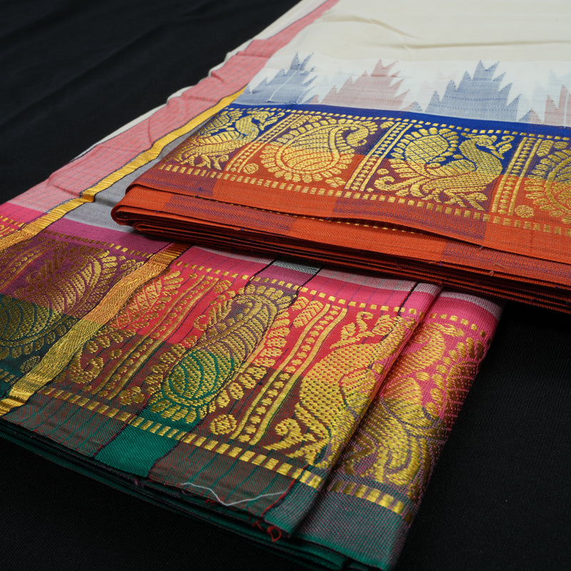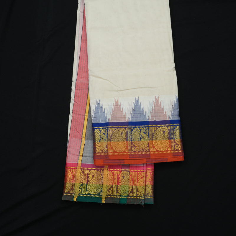 Experience the traditional elegance of the Hayagrivas Handloom 10*6 Pure Cotton Dhothi, featuring the classic Ganga Jamuna with traditional Temple border. Crafted from premium pure cotton, this dhothi offers superior comfort and breathability, ideal for daily wear or special occasions. The handloom weave ensures durability and a refined texture, reflecting expert craftsmanship. Perfectly sized at 10*6 feet, it provides ample length for versatile draping styles. Embrace heritage with this timeless piece that combines cultural authenticity with practical comfort.