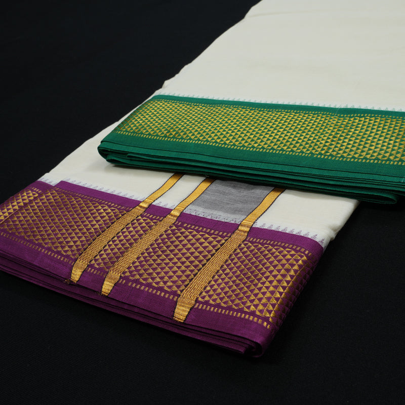 Authentic pure cotton dhoti featuring the traditional 10*6 weave with an elegant Ganga Jamuna border. Crafted for comfort and durability, this classic garment drapes beautifully for everyday wear or special occasions. The natural cotton fabric ensures breathability and softness against the skin. A timeless piece that honors traditional Indian textile craftsmanship.
