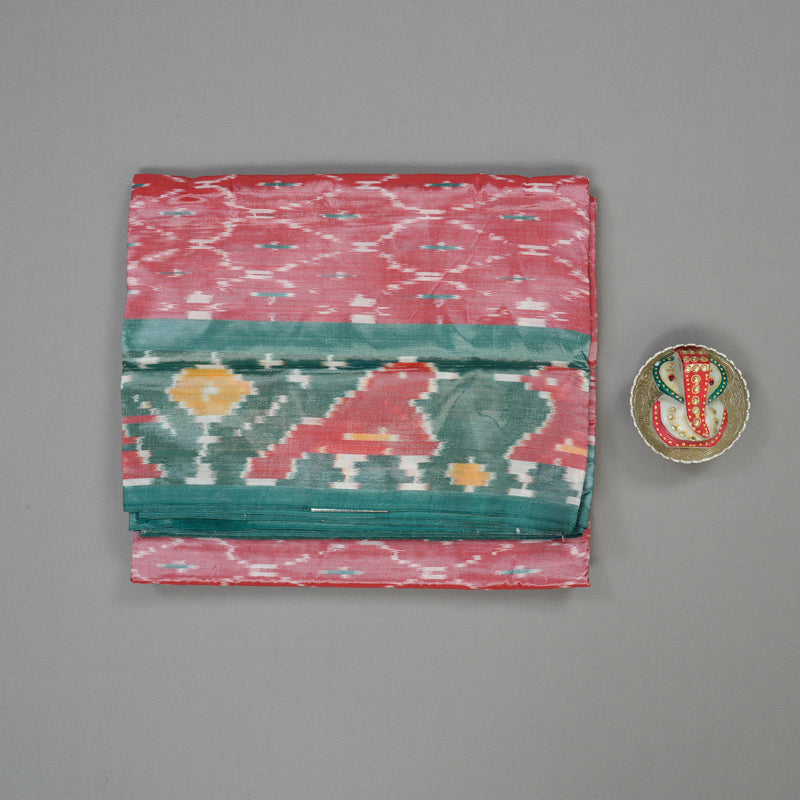 A classic, festive contrast defines this traditional Mild Red Ikkat Semi Cotton Saree, framed by a vibrant Rama Green Border. This Ikkat Semi Cotton showcases the timeless, all-over Ikkat pattern. This is an ideal semi cotton saree for traditional ceremonies and celebrations.