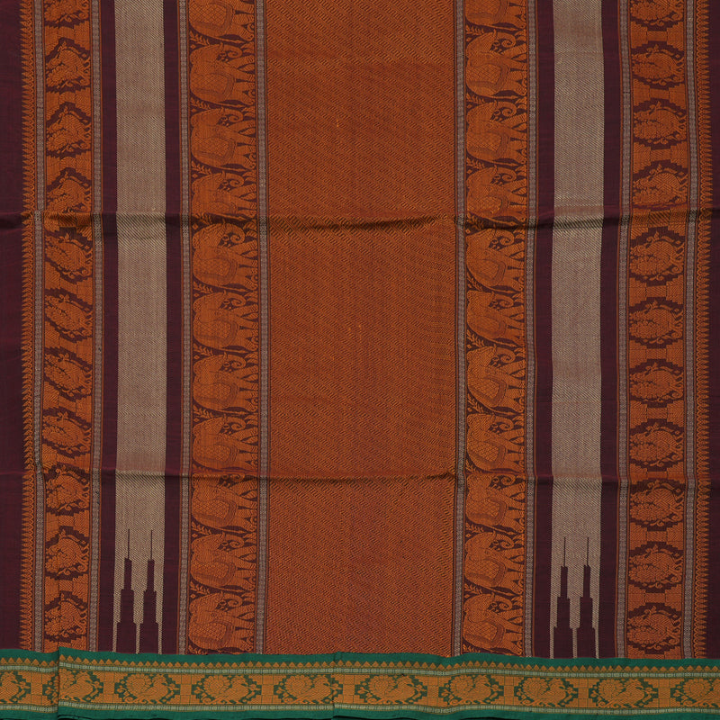 A deep, classic contrast defines this elegant Wine Maroon Pure Cotton Saree, framed by a vibrant Green Border. This Pure Cotton Saree features small paisley motifs on the body and peacock motifs on the border.