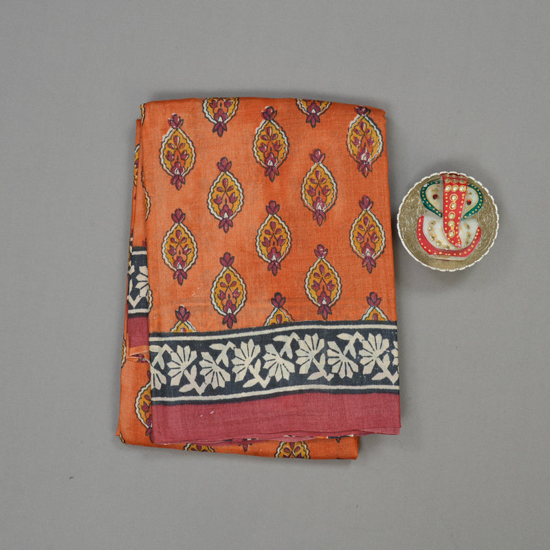 This beautiful Tussar Silk Saree in a warm burnt orange is a true eye-catcher. The body is adorned with intricate floral and paisley prints, creating a rich and detailed pattern. The vibrant red border provides a striking contrast, making it a festive and stylish choice.