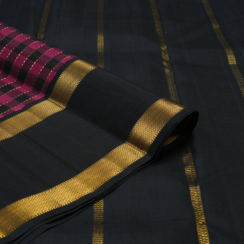 Make a sophisticated statement in this burgundy and black Handloom Kanjivaram, uniquely characterised by its meticulous horizontal jari lines that traverse the entire saree. The interplay of deep tones and shimmering metallic threads creates a modern, linear texture that reimagines the classic checkered aesthetic.