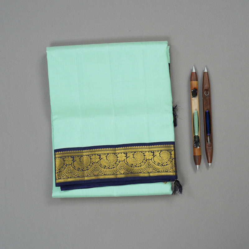 This pista green Kanjivaram silk saree showcases traditional korvai weaving with a striking navy blue pallu and peacock-adorned border. The refined colour contrast and handloom craftsmanship make it an exceptional choice for brides seeking authentic luxury.