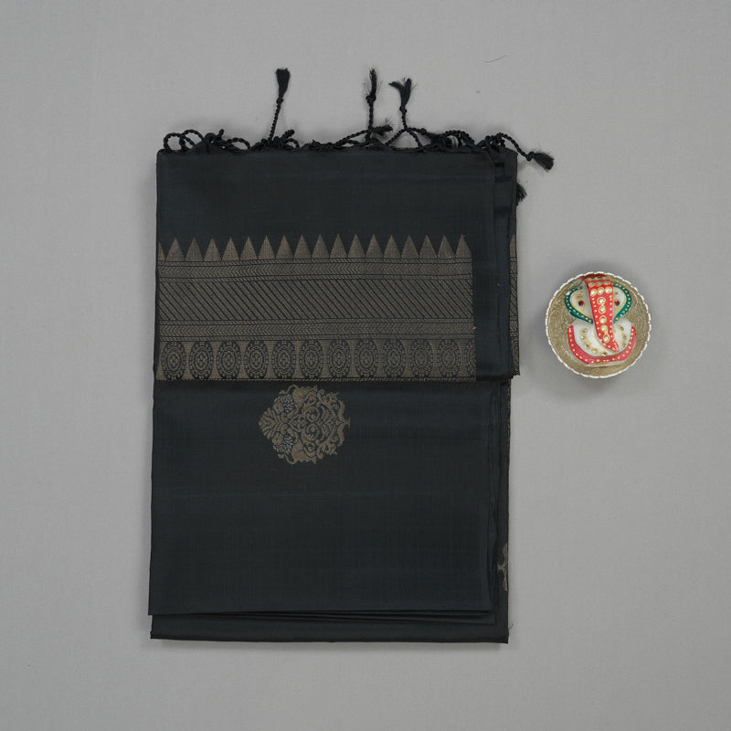 A deep, classic look defines this commanding Black Pure Soft Silk Saree. This Soft Silk Saree features elephant chakram motifs on the body.
