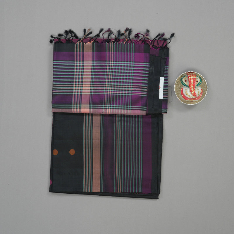 A deep, striking contrast defines this commanding Black Pure Soft Silk Saree, framed by a Multicolour Border. This Soft Silk Saree features rudraksha motifs on the body.