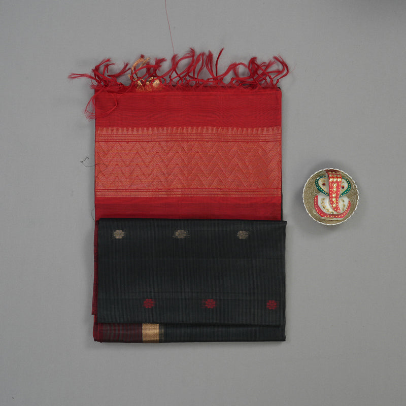 A deep, classic contrast defines this elegant Dark Grey Pure Kora Silk Cotton Saree, framed by a rich Araku Border. This Kora Silk Cotton Saree features small floral buttas on the body.