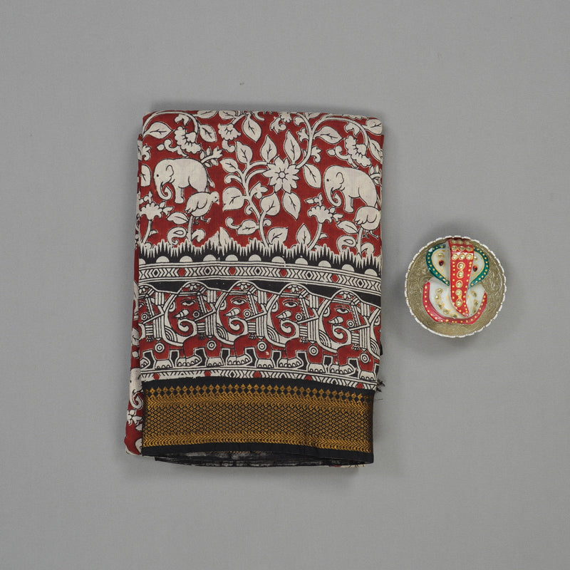 This is a simple, good-looking cotton saree in a maroon color, adorned with traditional Kalamkari block prints featuring detailed elephant and floral motifs on the body. It is framed by a bold black border and features a coordinating maroon pallu and beige blouse. The cotton fabric ensures a comfortable and soft drape.