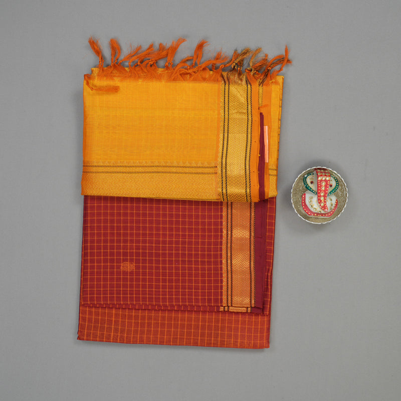 This Pure Silk Cotton Saree features a deep Maroon body accented with elegant thread checks for a refined texture. It is paired with a vibrant contrast Mango Yellow pallu and blouse, creating a classic and cheerful look.