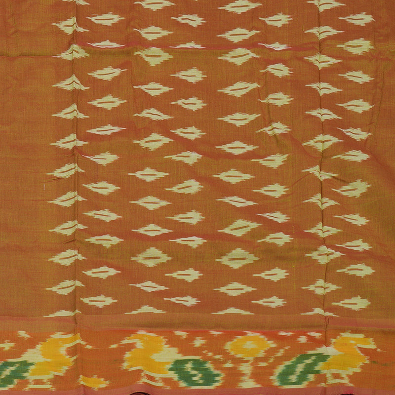 A gentle, unique contrast distinguishes this lovely Mehandi Green Ikkat Semi Cotton Saree, framed by a delicate Onion Pink Border. This Ikkat Semi cotton showcases the traditional, blurred Ikkat pattern across the body. This is an ideal semi cotton saree for everyday wear or social calls, offering comfort and style.