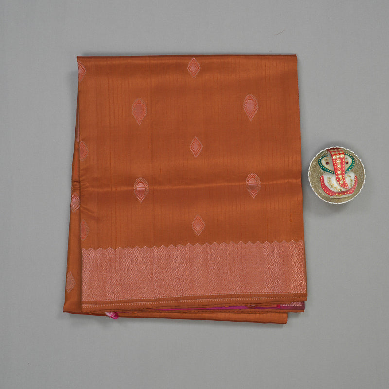 An earthy, warm look defines this elegant Rust Orange Pure Soft Silk Saree. This Soft Silk Saree features paisley motifs on the body.