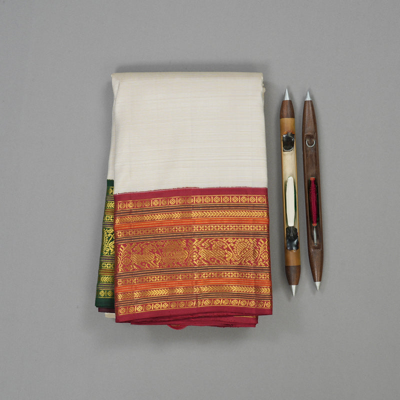 The ensemble is completed with a deep maroon pallu and blouse, featuring a richly woven pallu that adds a layer of traditional luxury. Priced at ₹21,580, this refined drape is perfect for special occasions where you want to balance understated elegance with grand heritage.