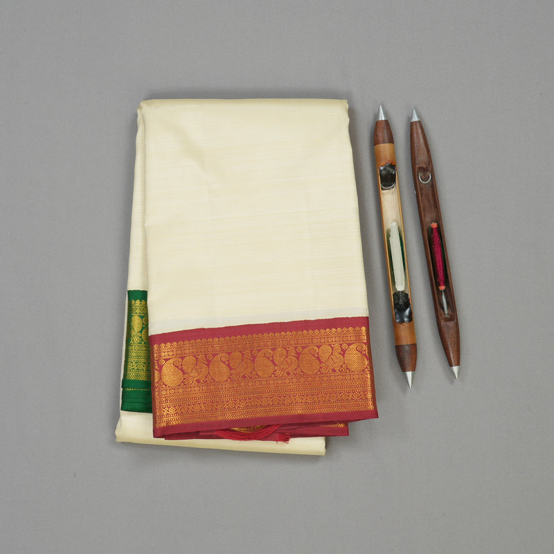 A soft, striking dual-tone contrast defines this serene Half White Korvai Contrast Kanjivaram Silk Saree, featuring a Ganga Jamuna border in Green & Maroon. This pure silk border is woven with peacock and paisley motifs.