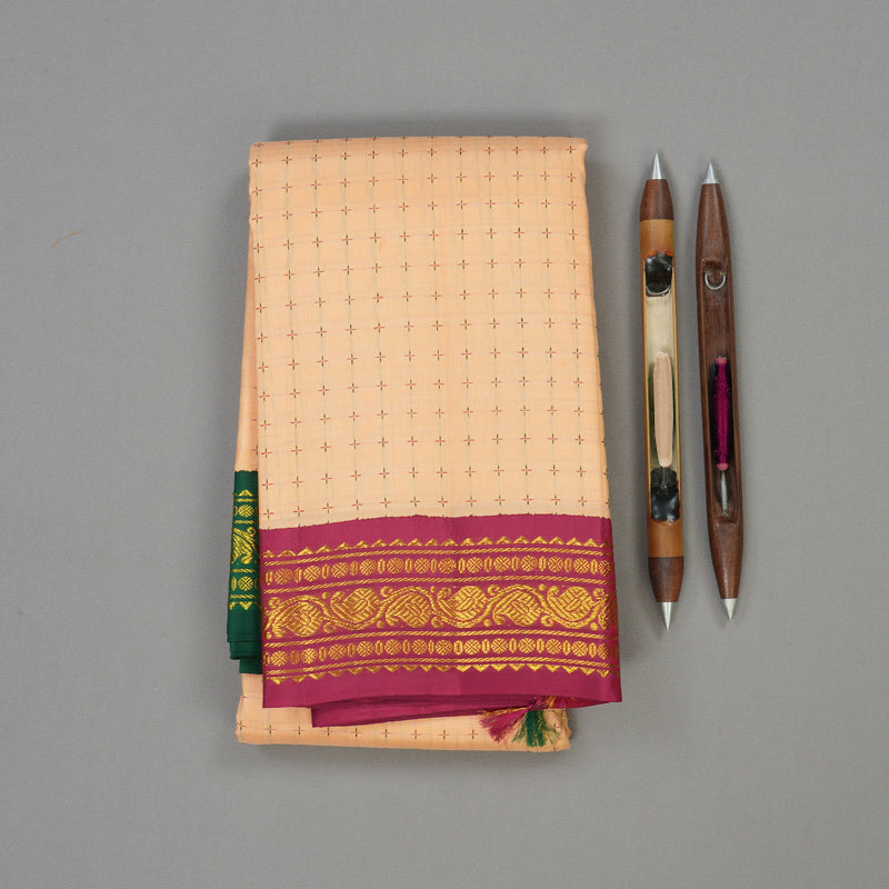 Discover the rare and auspicious dual-border design of this Korvai Contrast Peach Kanjivaram Silk Saree. The body is framed by a traditional Ganga Jamuna border (Green and Maroon on opposing edges), woven with delicate small paisely motifs.