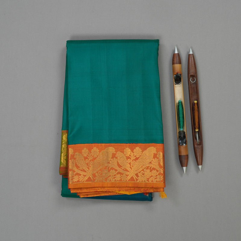 Step out in the beautiful triad of colour with this Korvai Contrast Rama Green Kanjivaram Silk Saree, featuring a Ganga Jamuna border in Manthalir (Deep Pink) and Orange. The border is beautifully woven with traditional bird motifs, adding a layer of charming detail to the striking colour contrasts.