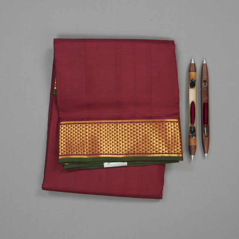 This traditional Maroon Madisar Saree is the epitome of South Indian textile history, presented in the ceremonial Handloom Ten Yards Drape. The pure silk body is complemented by a tonal Maroon & Manthalir Selvedge Border woven in the classic arai madam.