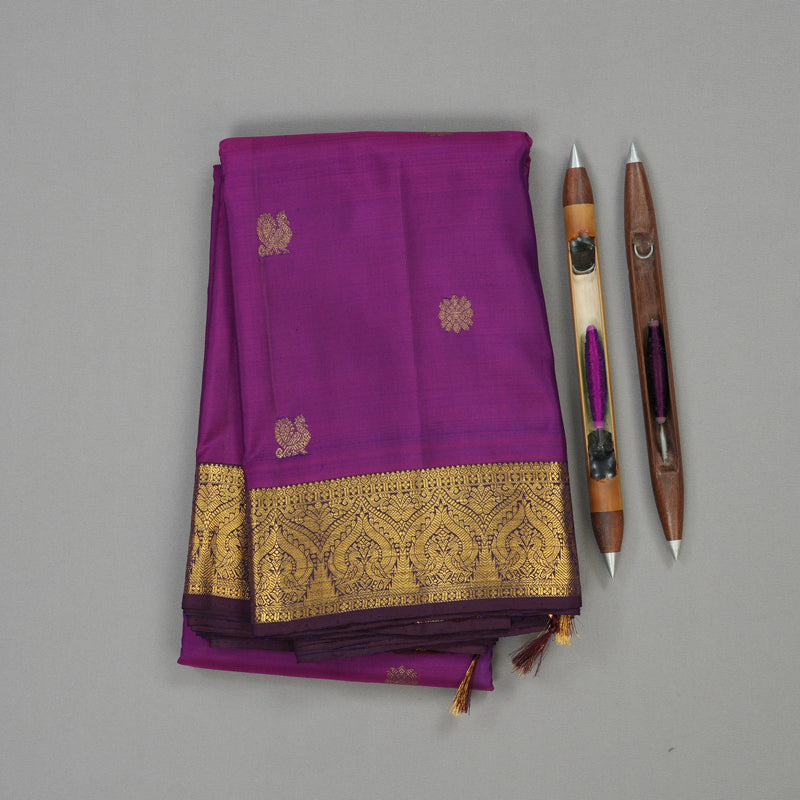 Exude the traditional charm of this rich Handloom Wine Purple Kanjivaram Silk Saree. This elegant Vintage Kanjivaram features delicate small floral buttas on the body. The border is adorned with auspicious twin peacock motifs, creating a sophisticated and all-over patterned drape.