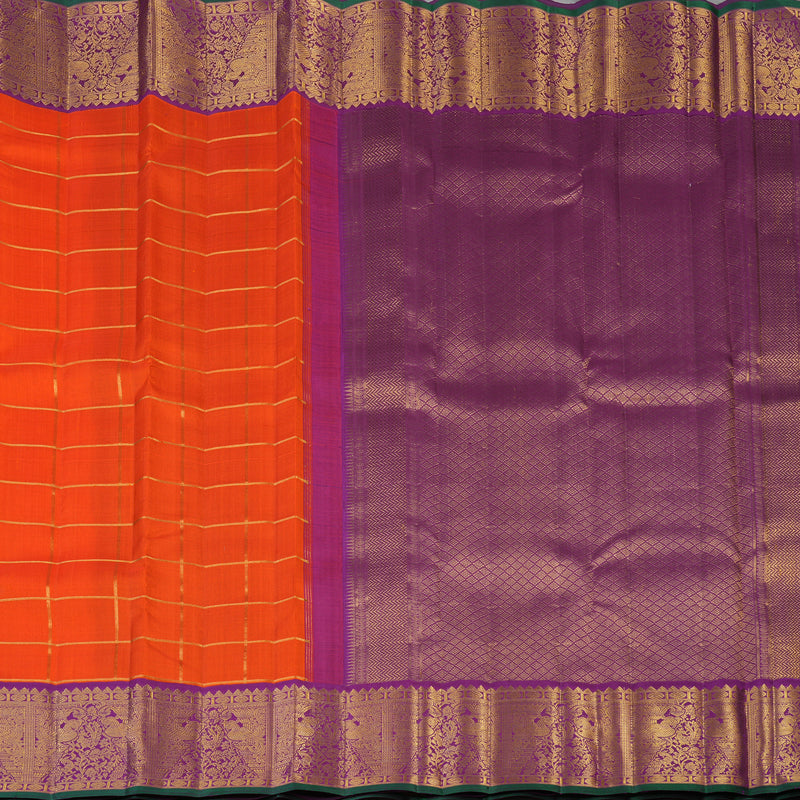 This magnificent Handloom Kanjivaram Silk saree features a vibrant fanta orange body layered with traditional jari checks for a rich, textured brilliance. It is defined by a grand woven border that showcases a masterful narrative of intricate peacock, rudraksham, and various heritage elements, framed beautifully by a crisp peacock green selvedge.