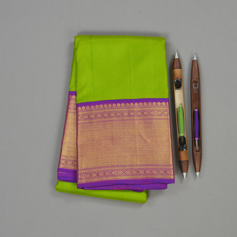 This striking handloom Kanjivaram silk saree is a celebration of contrast and tradition. The vibrant Fluorescent green body exudes freshness and brightness, perfectly balanced by the royal purple border and pallu.