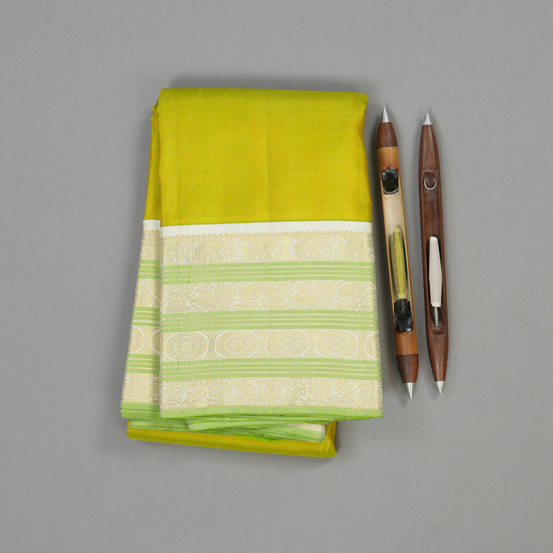 This elegant handloom Kanjivaram silk saree radiates freshness and serenity with its Fluorescent Green body adorned with subtle self-woven patterns, lending it a soft and refined texture.