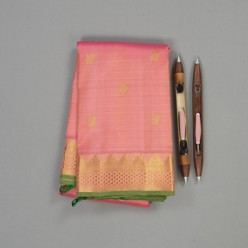 This mesmerizing handloom Kanjivaram silk saree is woven in a lively candy Baby pink hue, adorned with golden zari buttas scattered delicately across the body, adding a festive shimmer.