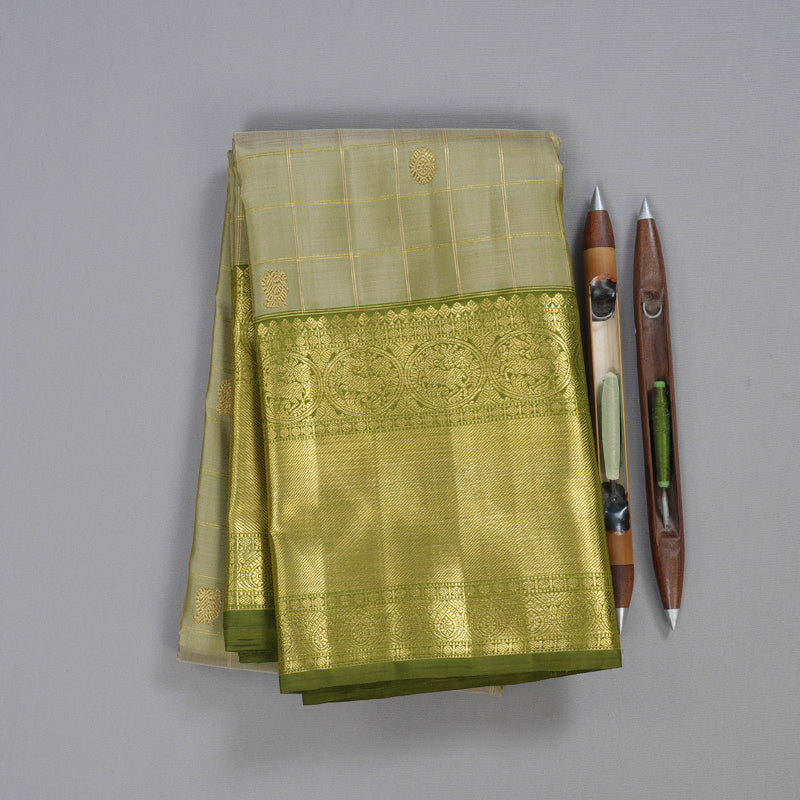 Classic and versatile, this beige Kanjivaram silk saree with an olive green border features intricate Yaazhi motifs. A perfect blend of subtlety and tradition, this saree suits any cultural or formal occasion. The saree has checked pattern on the blouse also, that is tha highlight of this saree.