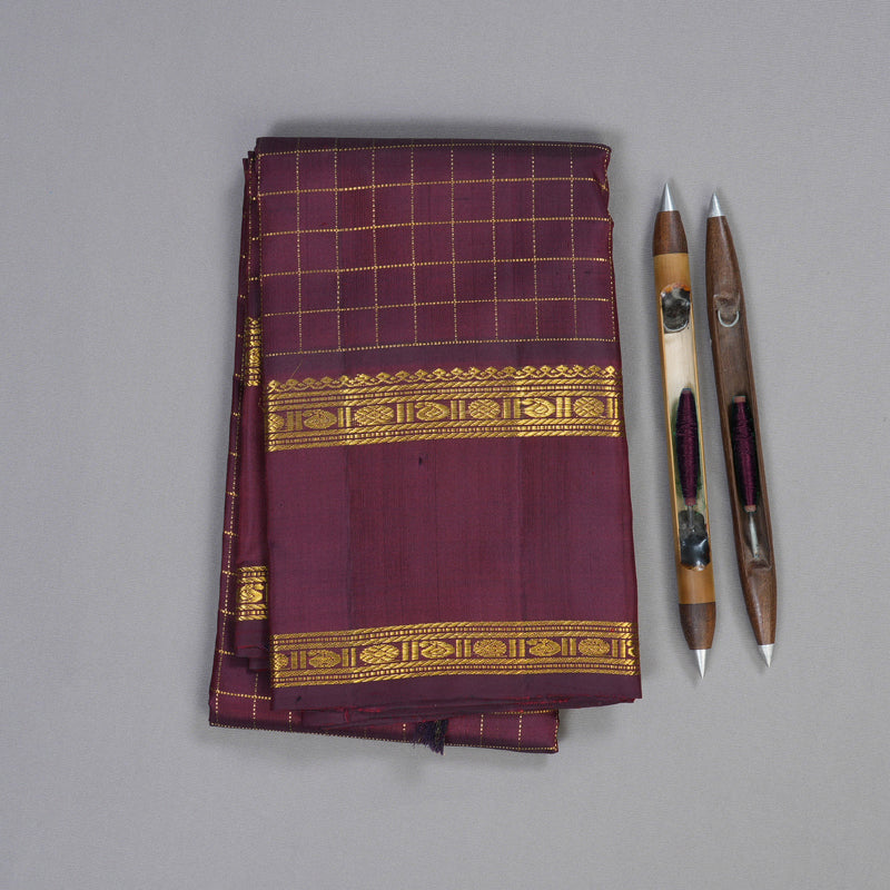 The body is a deep, opulent wine marron, radiating a sense of grandeur and luxury, adorned with golden Jarigai checks that shimmer subtly, adding depth and structure to the drape. The borders are a rich, wine marron, intricately woven with ornate golden zari patterns, creating a seamless blend of sophistication and tradition.
