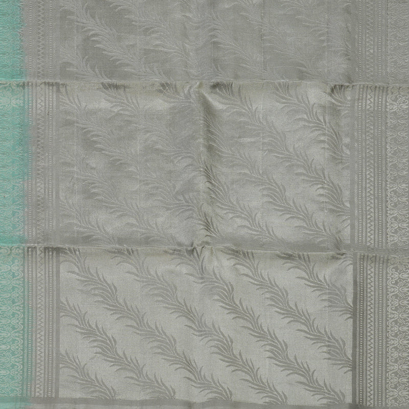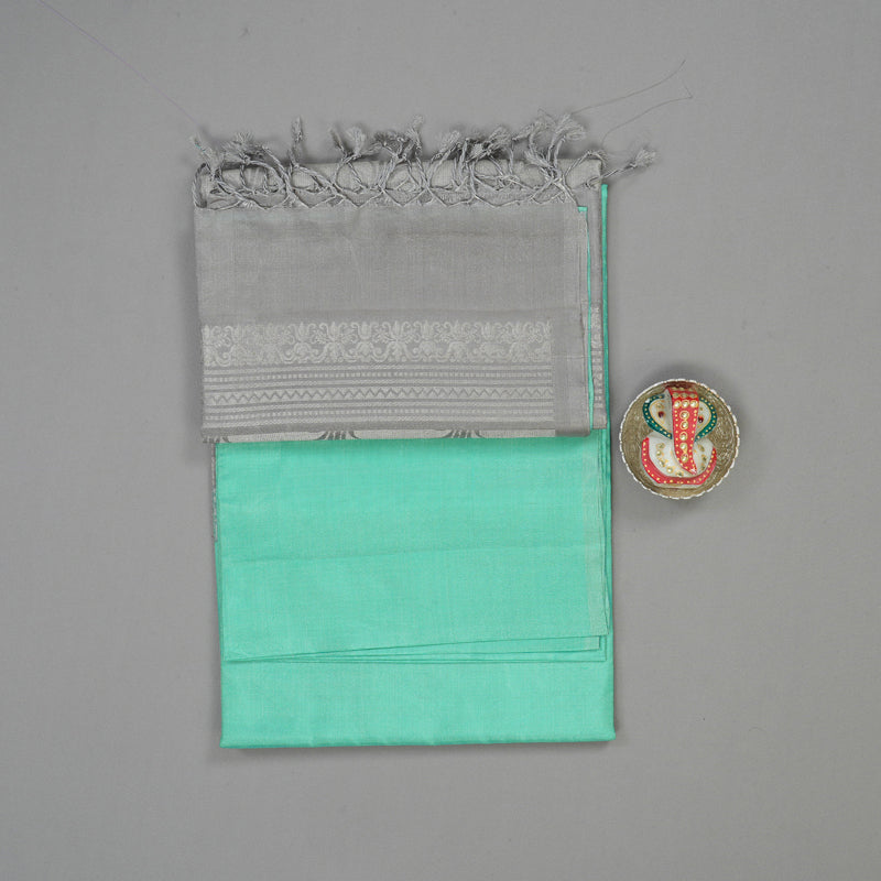 This ethereal Mint green Pure Soft Silk saree features a luminous tissue body that radiates a delicate, metallic glow. The modern borderless design transitions seamlessly into a sophisticated grey pallu and blouse, offering a unique and chic colour contrast that exudes high-fashion elegance.