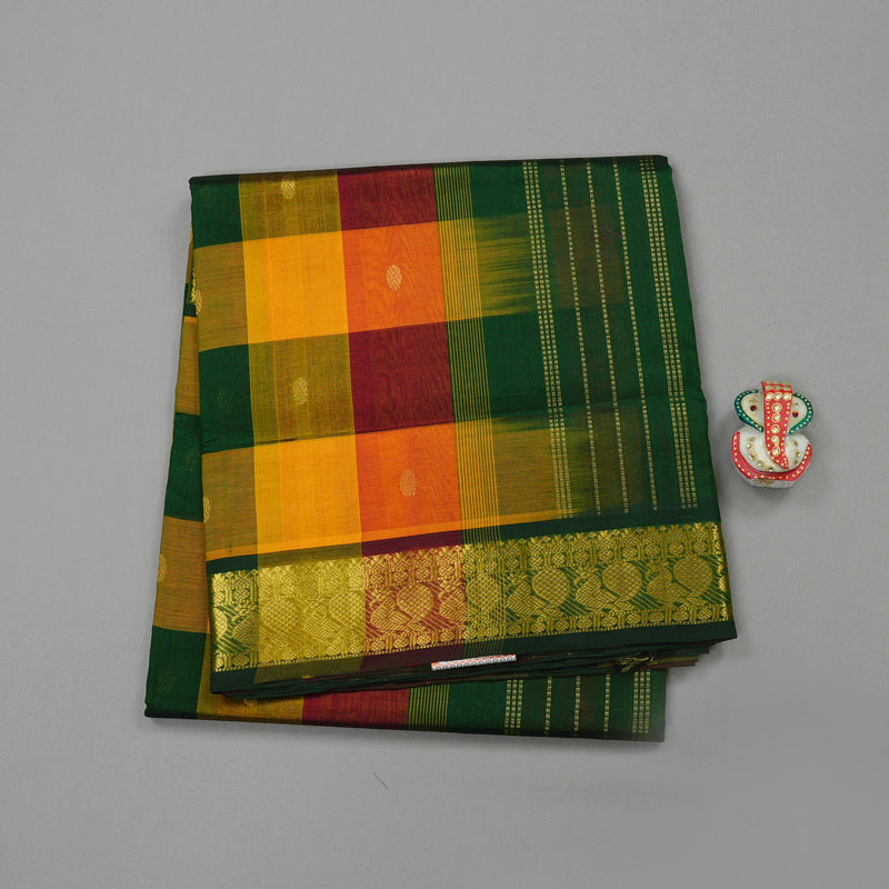 Crafted in pure silk cotton, this saree brings together rich heritage and breathable wear. The checkered pattern of mustard yellow, deep maroon, and bottle green feels festive yet grounded—ideal for traditional events, Navratri gatherings, or even a family celebration.