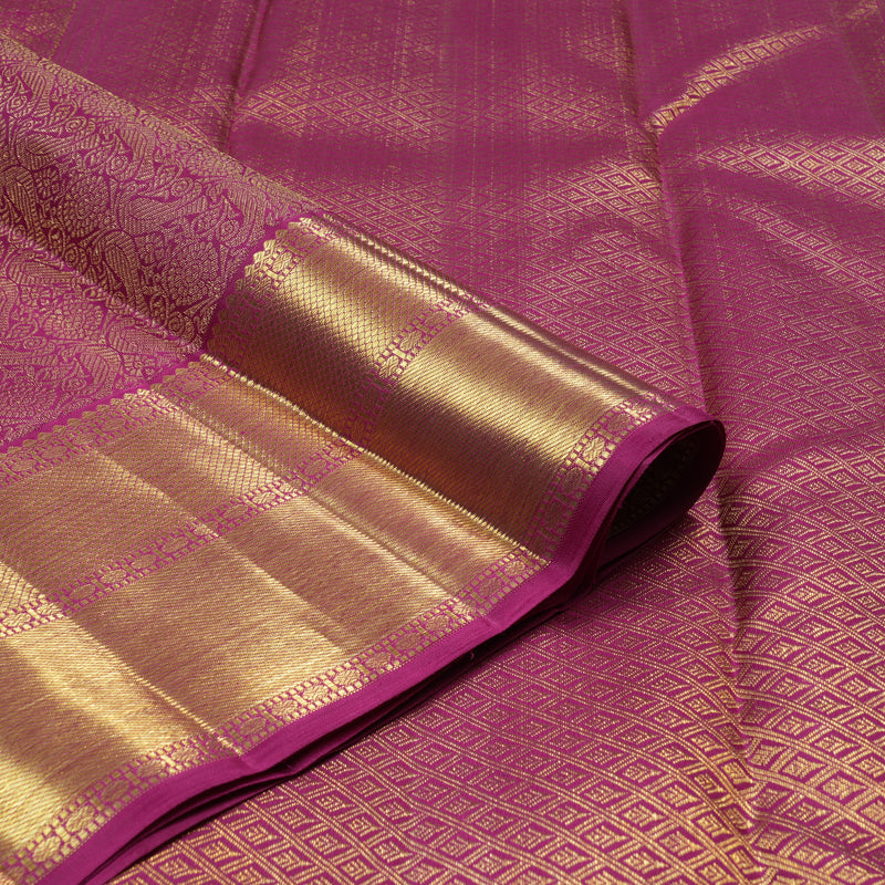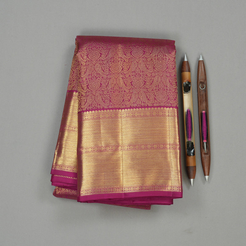 This exquisite handloom Kanjivaram silk saree dazzles in a deep magenta pink hue, richly adorned with intricate pure zari weaving across the pallu and body. The saree showcases traditional motifs like peacocks, floral vines, and chakra patterns, all meticulously woven in shimmering gold zari. The broad golden border adds grandeur with its bold, symmetrical detailing, perfectly framing the richness of the weave. A regal and timeless drape, this piece is ideal for weddings, grand festivities, and ceremonial occasions. This beauty is priced at ₹40560 only.n A neatly woven kanjivaram.