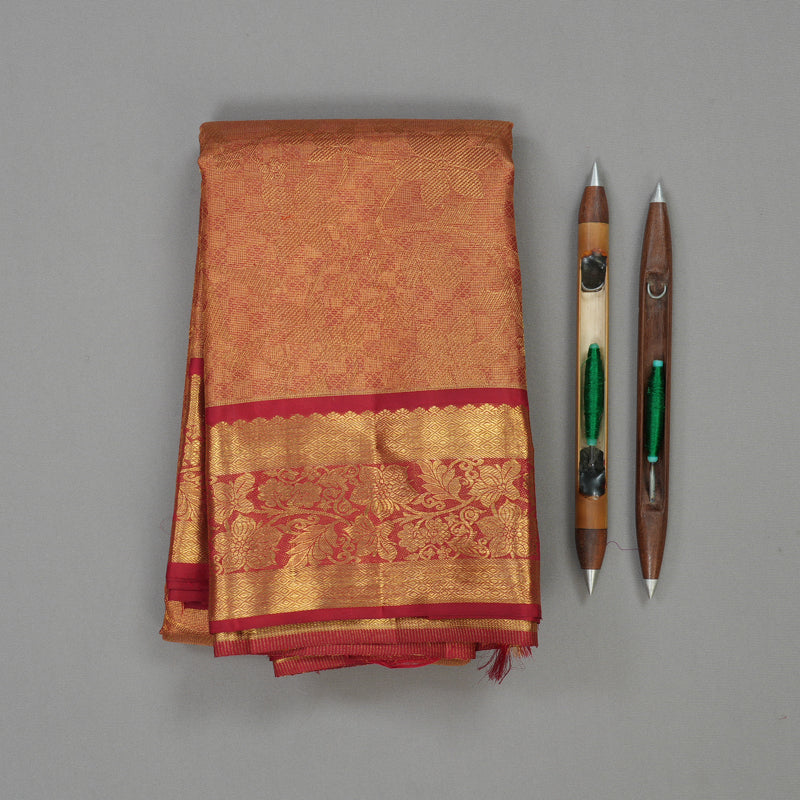 This magnificent Hayagrivas Bridal Vintage Kanjivaram Silk Saree in a regal golden maroon is the epitome of opulence and tradition. The entire saree, from the body to the rich border, is a canvas of intricate floral motifs meticulously woven into the fabric. The deep maroon border creates a seamless, monochromatic look, allowing the detailed floral designs to stand out with a subtle elegance that's perfect for a bridal ensemble. The luxurious silk and dense weaving give this saree a substantial feel, making it a true heirloom piece.
