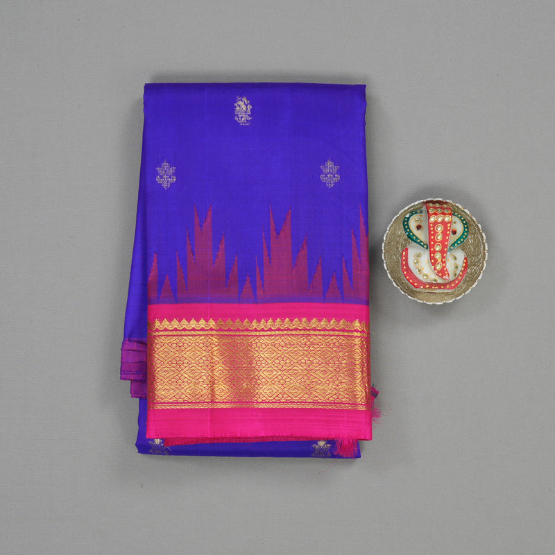 Refined one-sided Kanjivaram silk saree in purplish blue with a striking contrast temple border that adds traditional grandeur. The vibrant rani pink pallu provides a bold pop of colour, creating an eye-catching ensemble.