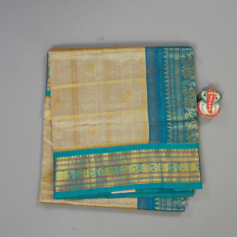 Graceful and refreshing, this saree features a gentle beige body adorned with golden zari checks and buttas that add subtle richness without overwhelming the eye. The charm lies in its sea blue border, pallu, and blouse, which infuse a pop of cool elegance into the look.