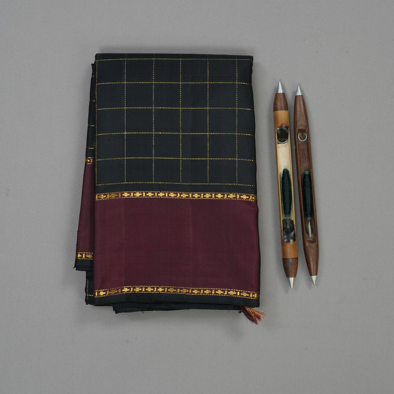 A deep, classic contrast defines this elegant Black Vintage Kanjivaram Silk Saree, framed by a rich Wine Maroon Border. This pure silk heirloom features Jari Checks on the body and a Rettapet border woven with traditional buttas.