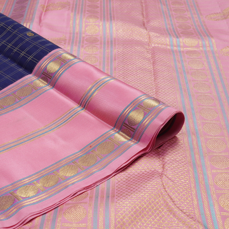 This Handloom Kanjivaram features a regal dark blue body meticulously woven with shimmering jari checks. The deep, midnight-toned silk provides a grand and soulful radiance, offering a sophisticated textured canvas.