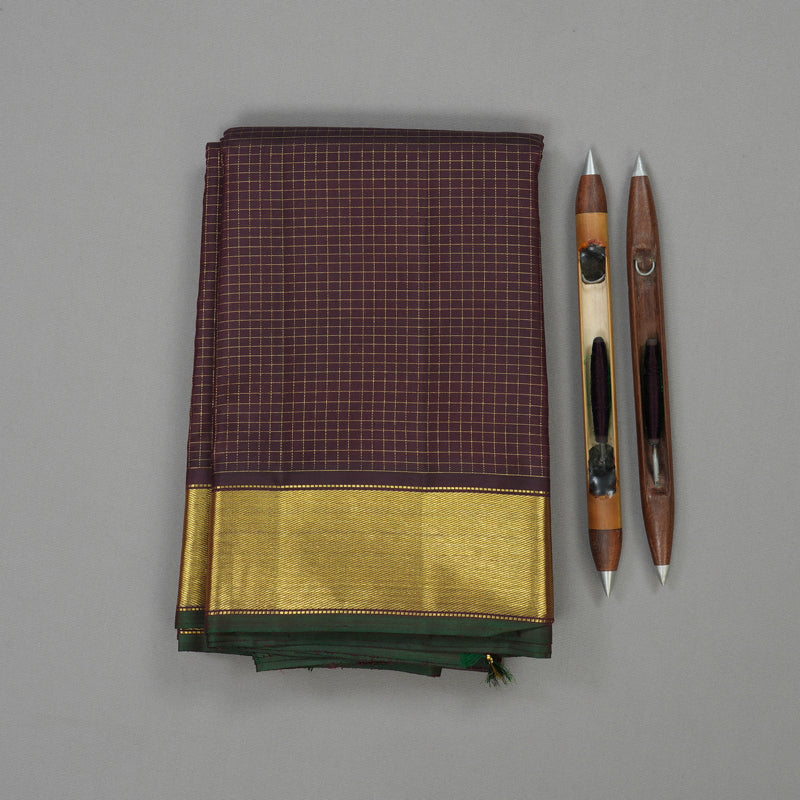This elegant Vintage Kanjivaram Silk Saree in a deep dark brown is a testament to sophisticated style. The saree's body features intricate Jari Checks, which add a subtle texture and shine. The rich green border provides a lovely contrast, creating a refined and elegant look.